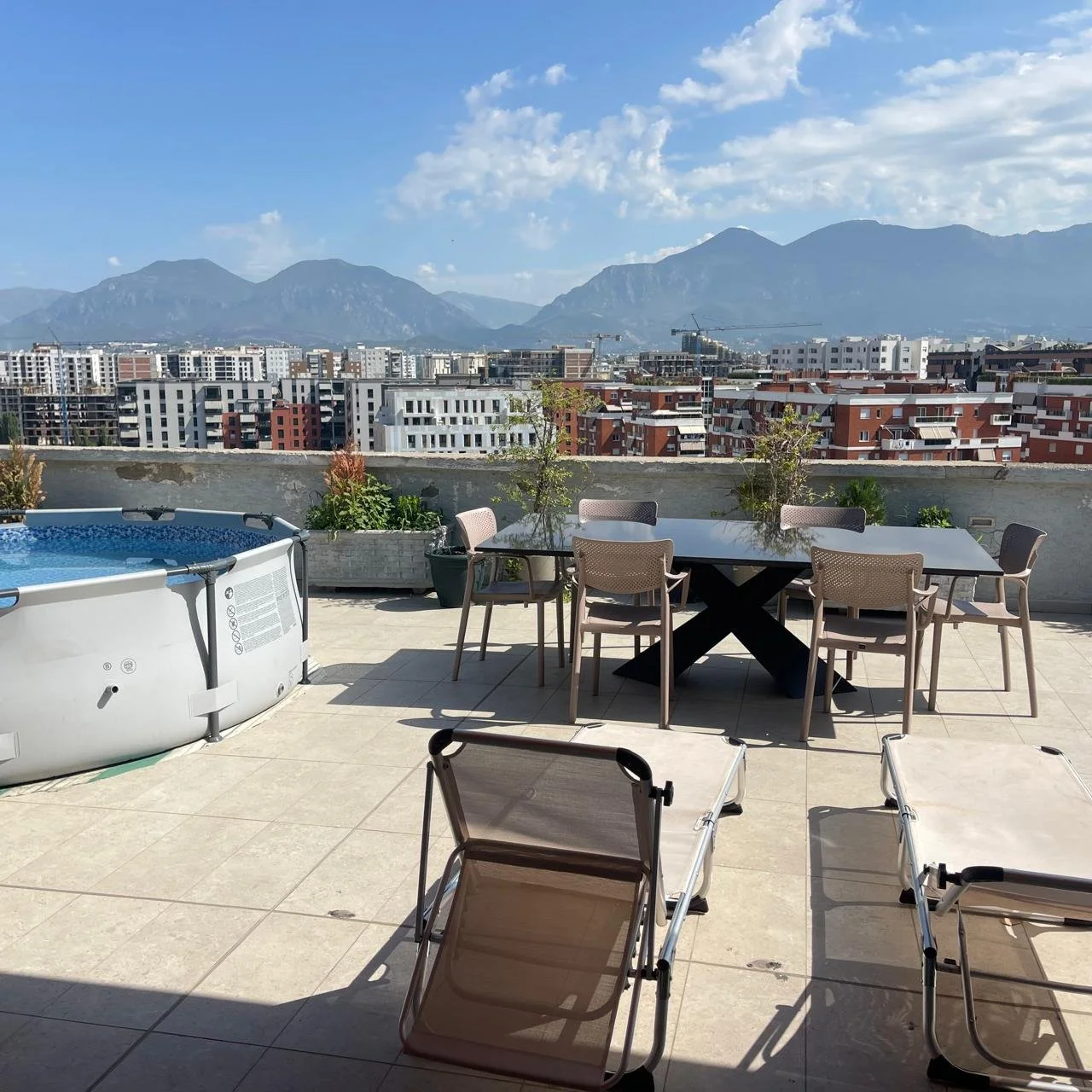 Enjoy your stay in this modern 3-bedroom rooftop apartment in Astir, Tirana. With a private pool, hot tub, and spacious terrace offering panoramic mountain and city views, it’s the perfect retreat for families, friends, or business travellers. The apartment is fully equipped with a kitchen, Wi-Fi, air conditioning, and private underground parking.